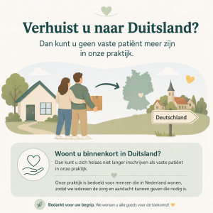 Om goede en veilige zorg te bieden zijn we wettelijk verplicht om binnen 15 minuten bij onze patiënten te zijn, in geval van spoed. Patiënten die verder weg wonen van de praktijk worden daarom dringend verzocht om een huisarts te zoeken die dichter in de buurt gevestigd is. Mocht dit op u van toepassing zijn dan nemen we in de komende tijd contact met u op om dit te be
